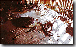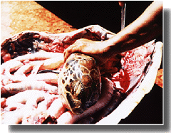 Read more: The plight of the Green Sea Turtle One of many malnourished and injured turtles being held during June 1997 in pens in Tanjung, Bali, only one km. from the popular Nusa Dua tourist resorts. This one showed evidence of injures including an open head injury normally a result of appalling treatment in the movement and transportation of the turtles to the slaughtering grounds in Bali. |