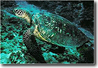 Green Sea Turtle (Chelonia mydas) Sea turtles are graceful saltwater reptiles, well adapted to life in their marine world. The green sea turtle is a medium to large brownish sea turtle with a radiating or mottled pattern of markings on the shell. The head is small in comparison to the other sea turtles and the biting edge of the lower jaw is serrated. Adult shell lengths range in size from 0.9-1.1 meters (36-43 inches) and weights average 90-137 kilograms (200-300 pounds). The greatest cause for the decline of green turtles has been commercial harvest for eggs and food, as well as their use for leather and jewelry.